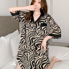 Women Nightgowns Satin Silk Zebra Striped Print Sleepwear Buttons Nightwear Dress Sexy Lingerie Gown Robe Homedress Nightdress