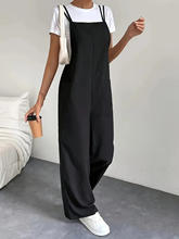 Fashion casual women’s pure black jumpsuit pants with pockets, shoulder straps, thin straight leg workwear pants, wide leg pants